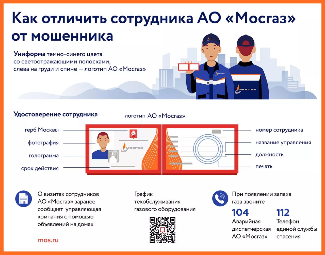 Дополнительно отмечаем, что при проведении ТО ВДГО и ВКГО специалисты Общества одеты в форму синего цвета с надписью на куртке: «МОСГАЗ» с символикой Общества. У каждого сотрудника имеется удостоверение (с фотографией, голограммой, логотипом АО «МОСГАЗ» и гербом Москвы), которое предъявляется при посещении квартир жителей.